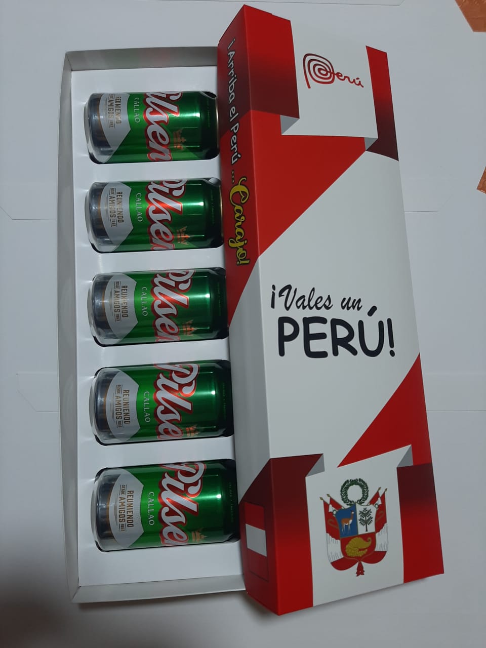 Caja Chelera Arriba Perú con cinco latas de Cerveza Pilsen para regalo del Dia del Padre o en cualquier ocasión, Delivery a partir de 2 Unidades.